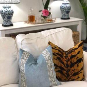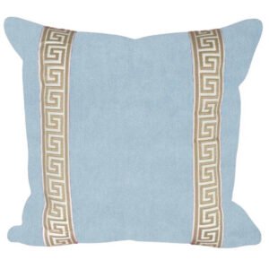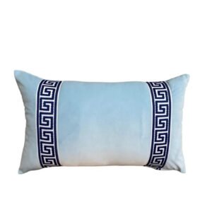 Designer Pillow cover grey Greek Key light blue trim tape velvet fretwork lumbar bolster throw custom Piping high end decorative chinoiserie