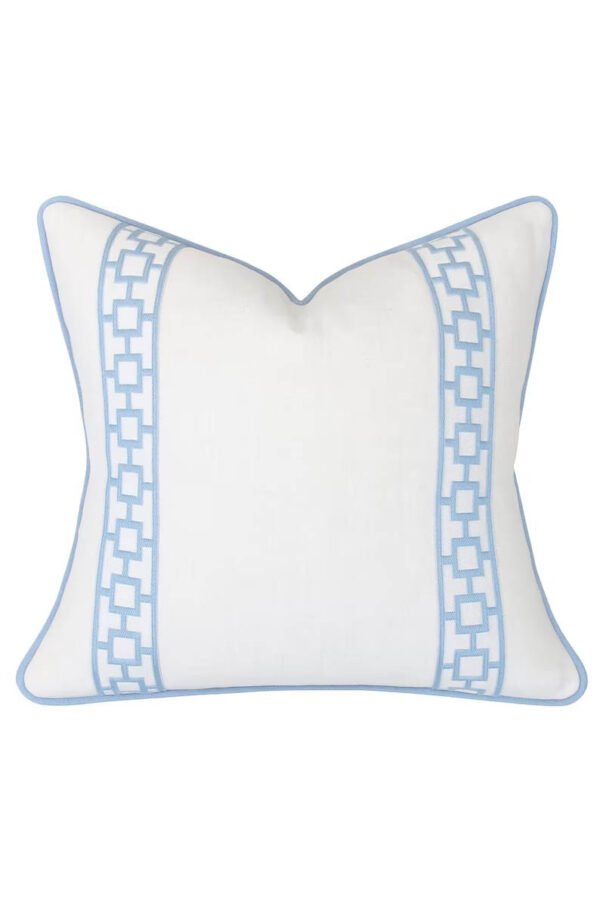 Be the first to review “Designer off white linen Pillow cover light blue trim tape fretwork lumbar bolster throw Piping decorative chinoiserie USA Made”