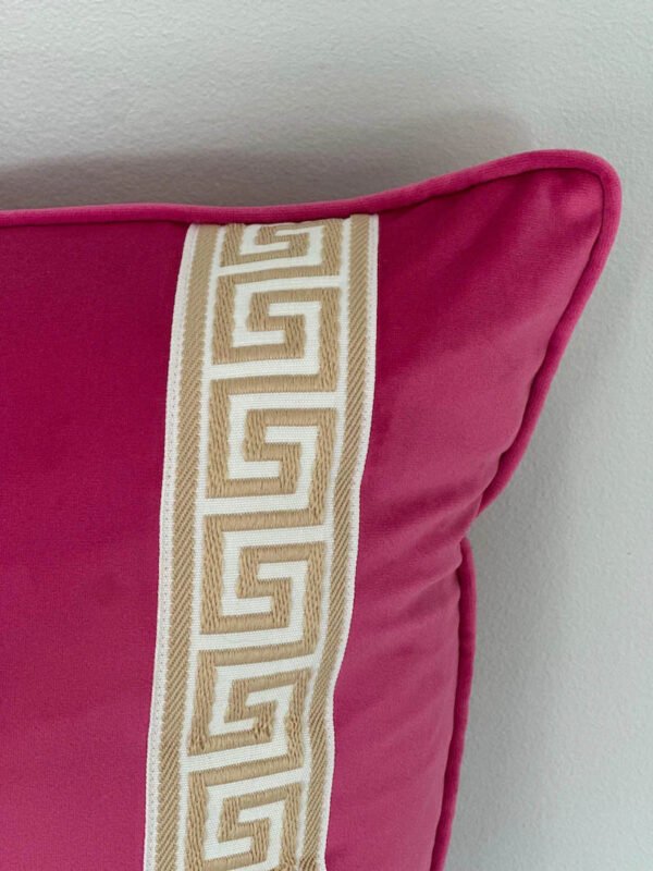 Designer Pillow cover hot pink Rasberry velvet Beige Greek Key trim tape lumbar bolster throw custom Piping high end decorative chinoiserie