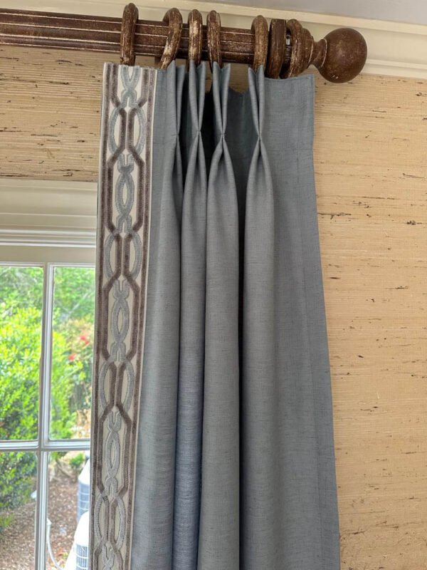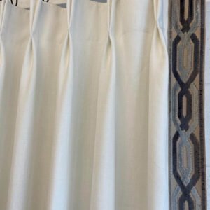 These curtains showcase a timeless two-finger euro pleat, beautifully enhanced with a 3.5” trim featuring classic fretwork trim inner edges.