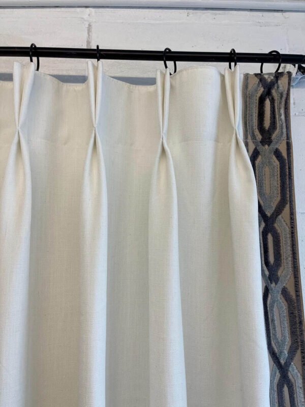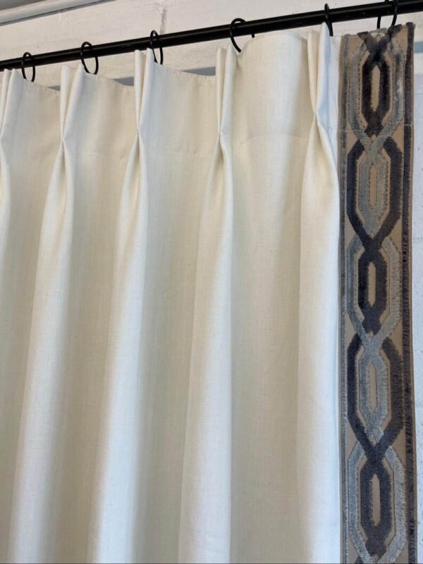 Linen Pinch Pleat drapes off white with trim tape curtains French pleated fretwork grey charcoal trimming lining blackout 36” x 84” in stock