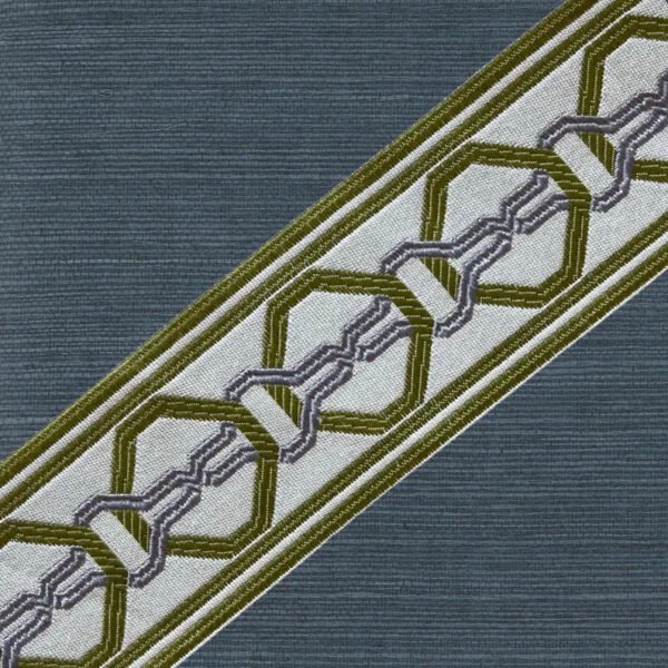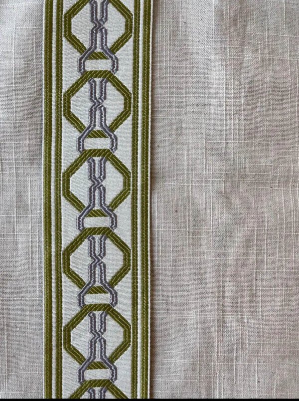 These curtains showcase a timeless two-finger pleat, beautifully enhanced with a 2.15” trim featuring a beautiful moss green fretwork design